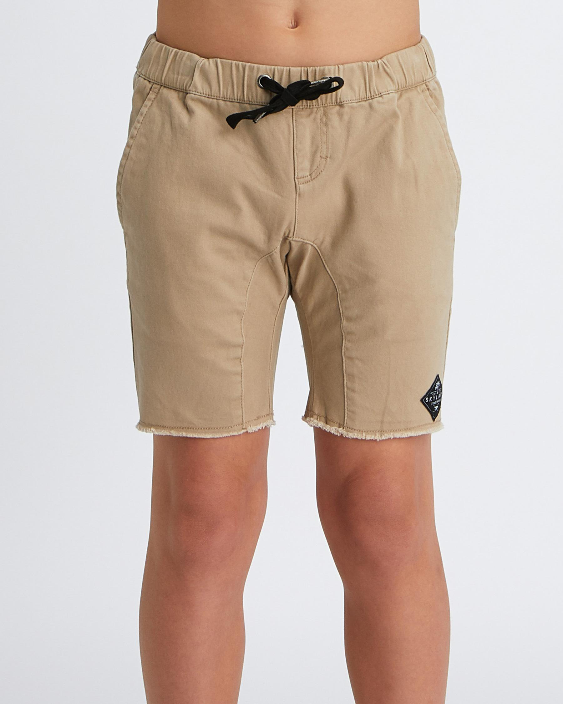 The Skylark Boys' Erase Drop Crotch Shorts in Light Sand offer a stylish and comfortable option for boys' everyday wear.