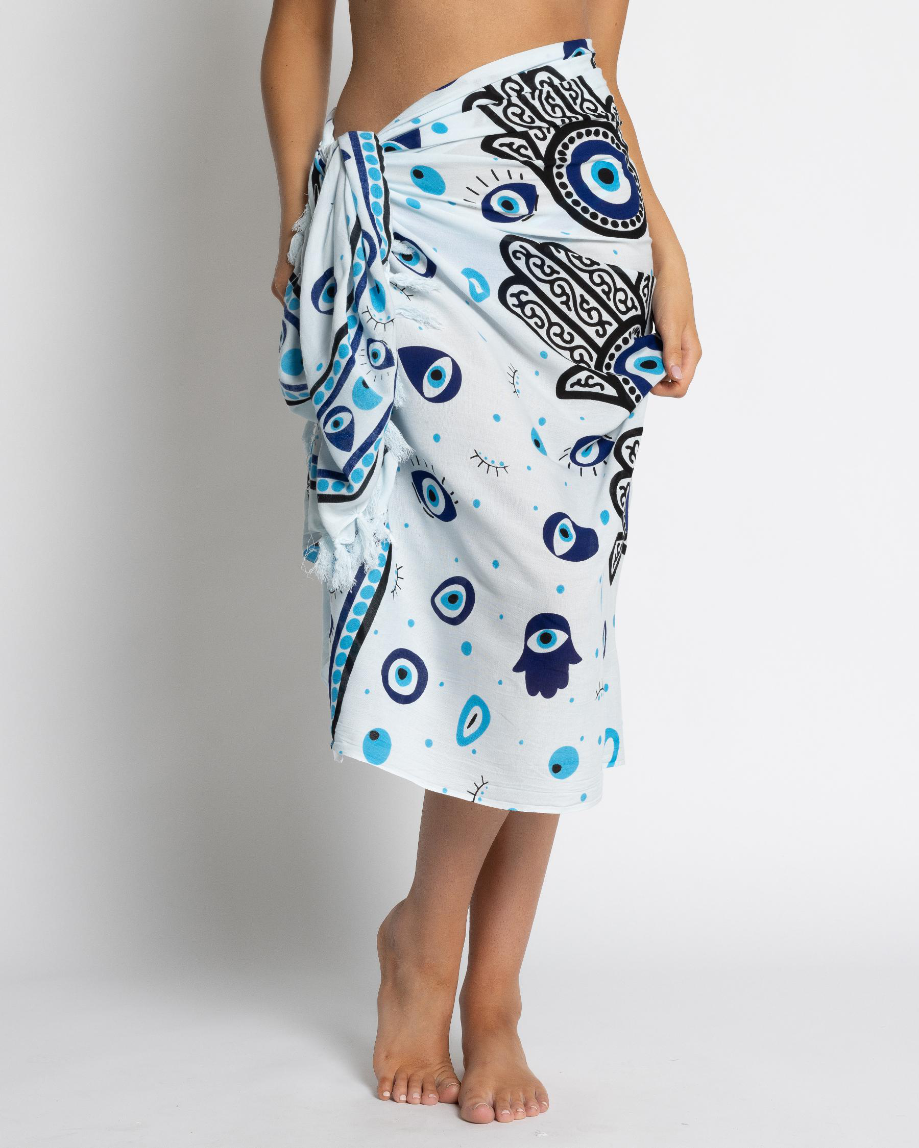 Featuring a striking white and blue evil eye design, the Topanga Evil Eye Sarong is a stylish addition to your beachwear collection.