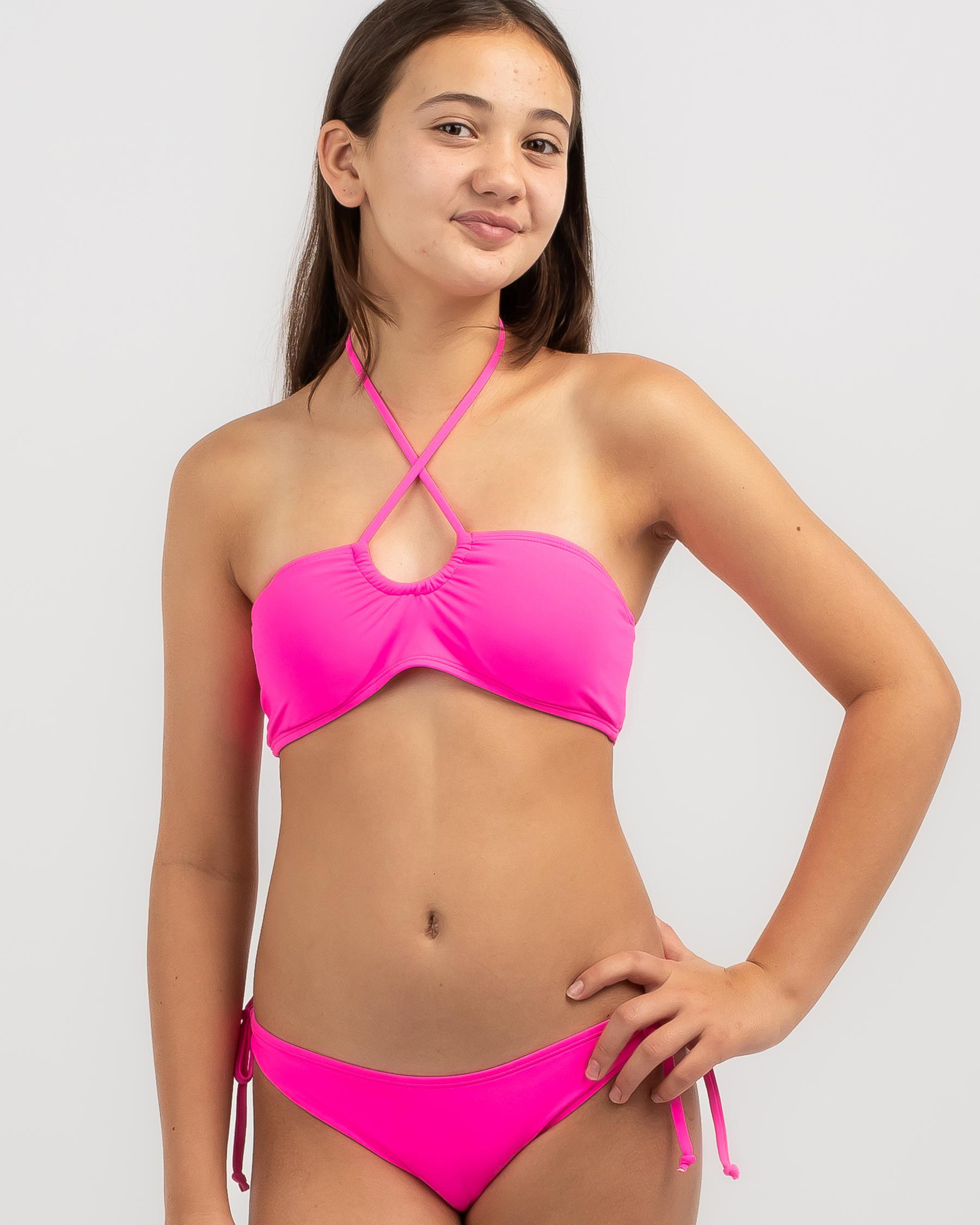 The Topanga Girls' Louise Bandeau Bikini Set in Pink Punch is a vibrant and playful swimwear option for fun in the sun.